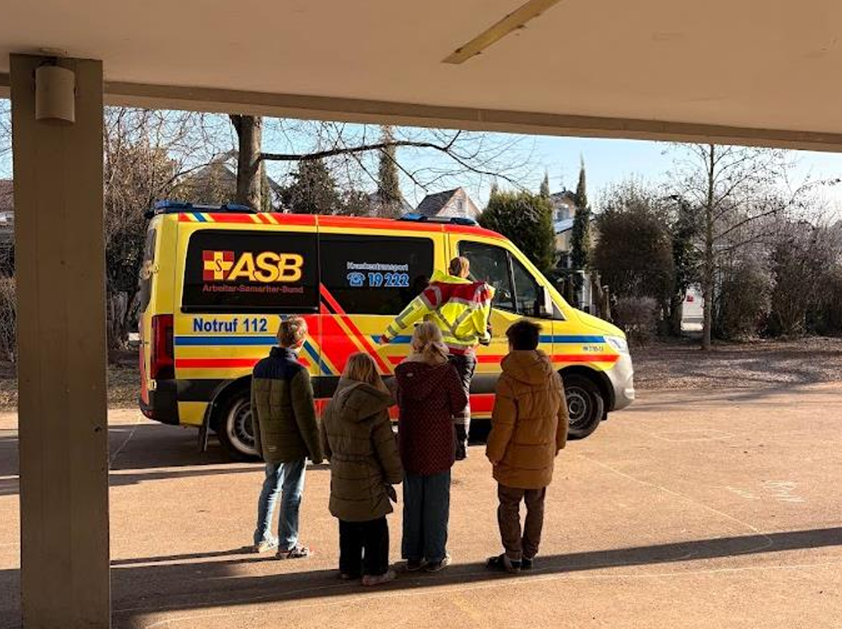 Ein besonderes Highlight war der Einsatz der Übungspuppe „Daniel“. Gemeinsam spielten die Kinder einen Unfall nach und riefen bei der Leitstelle einen Krankenwagen. Zur großen Überraschung fuhr dieser tatsächlich auf den Schulhof der Grundschule. Zusammen mit den Sanitätern brachten die Kinder „Daniel“ fachgerecht in den Krankenwagen. Danach durften sie im Fahrzeug Platz nehmen und einen Blick ins Innere des Rettungswagens werfen.